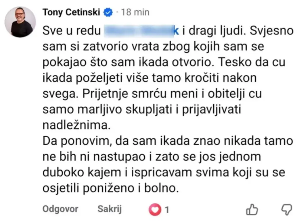 "Svesno sam zatvorio vrata zbog kojih sam se pokajao što sam ikada otvorio. Teško da ću ikada poželeti više tamo da kročim nakon svega. Pretnje smrću meni i porodici ću marljivo da skupljam i da prijavim nadležnima", napisao je Toni Cetinski i dodao: