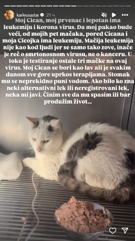 Ona je sada putem svog profila saopštila da dve njene mačke imaju leukemiju, kao i da ostale tri tek treba da testira.