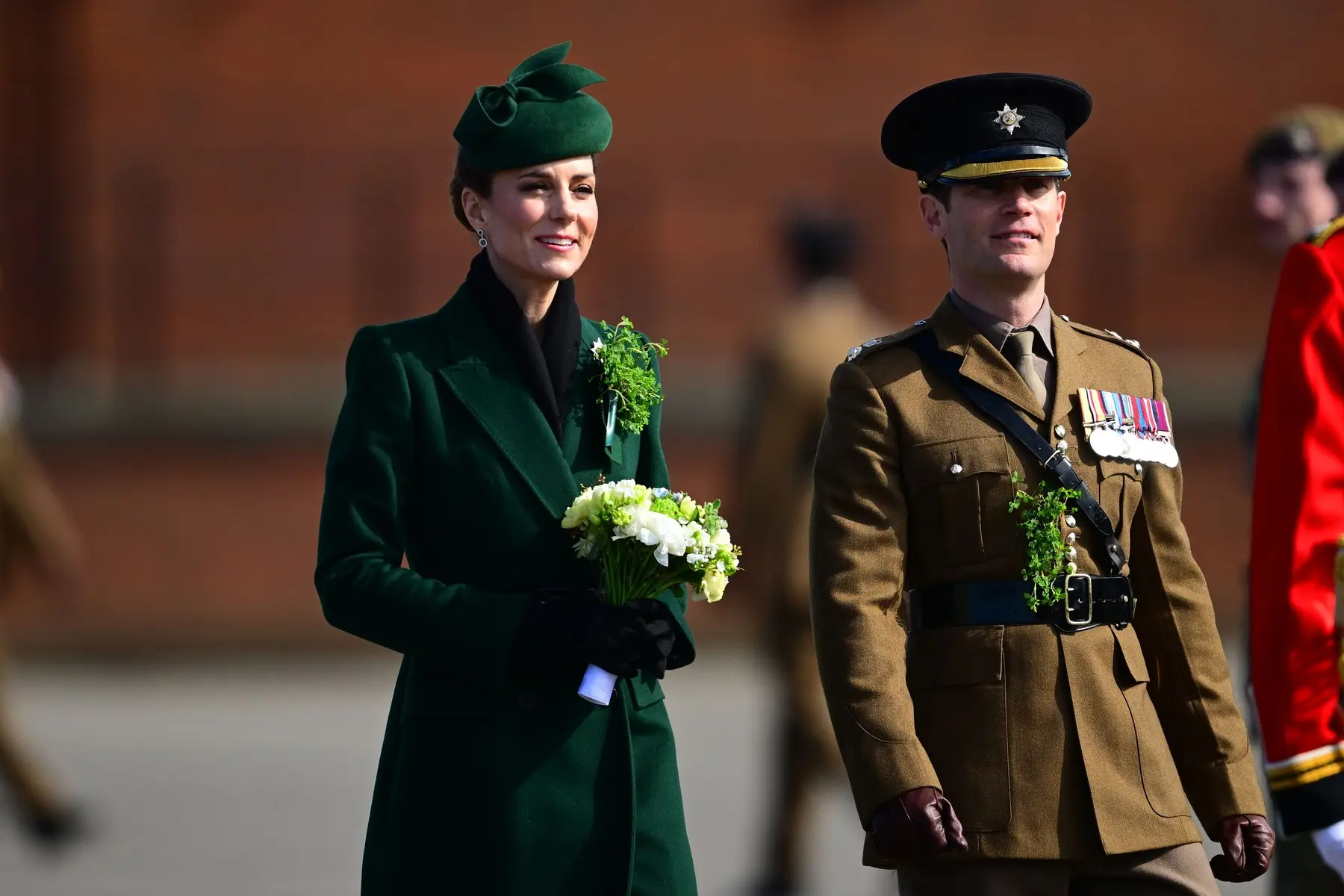 Princeza od Velsa Kejt Midlton prisustvovala je svečanosti Irske garde i obeležavanju Dana Svetog Patrika u Olderšotu na jugoistoku Engleske. Tradicionalno je za ovaj praznik podelila grančice deteline pripadnicima ovog puka. Grančicu ove biljke namenila je i za irskog vučjeg hrta po imenu Simus.