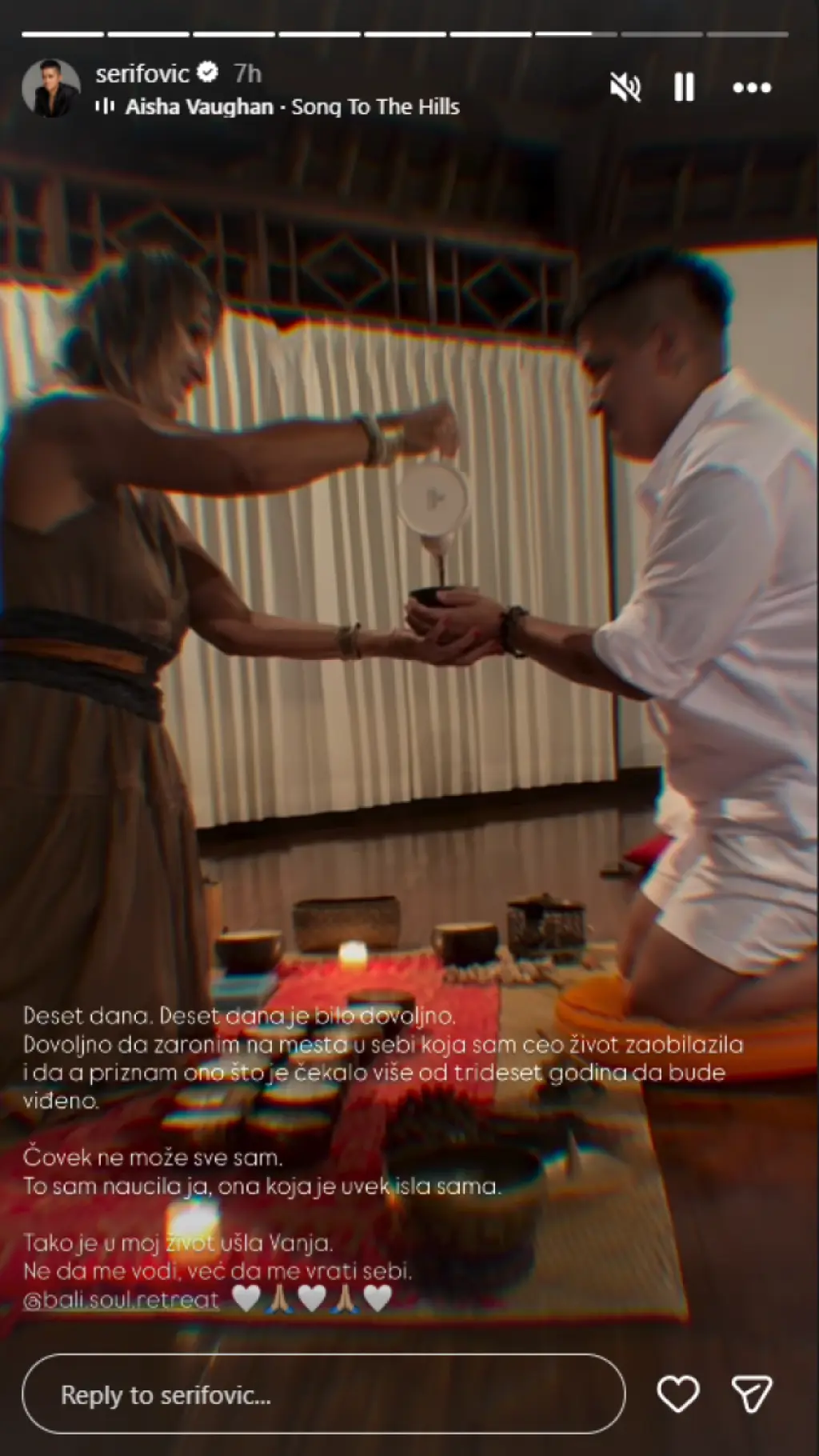 "Bali je jedno strašno mesto, magično mesto. Na Bali svako dođe po ono što mu nedostaje. Ja ne mogu da vam kažem po šta sam išla, ali mogu da vam kažem da sam to nešto pronašla", rekla je Šerifovićeva.