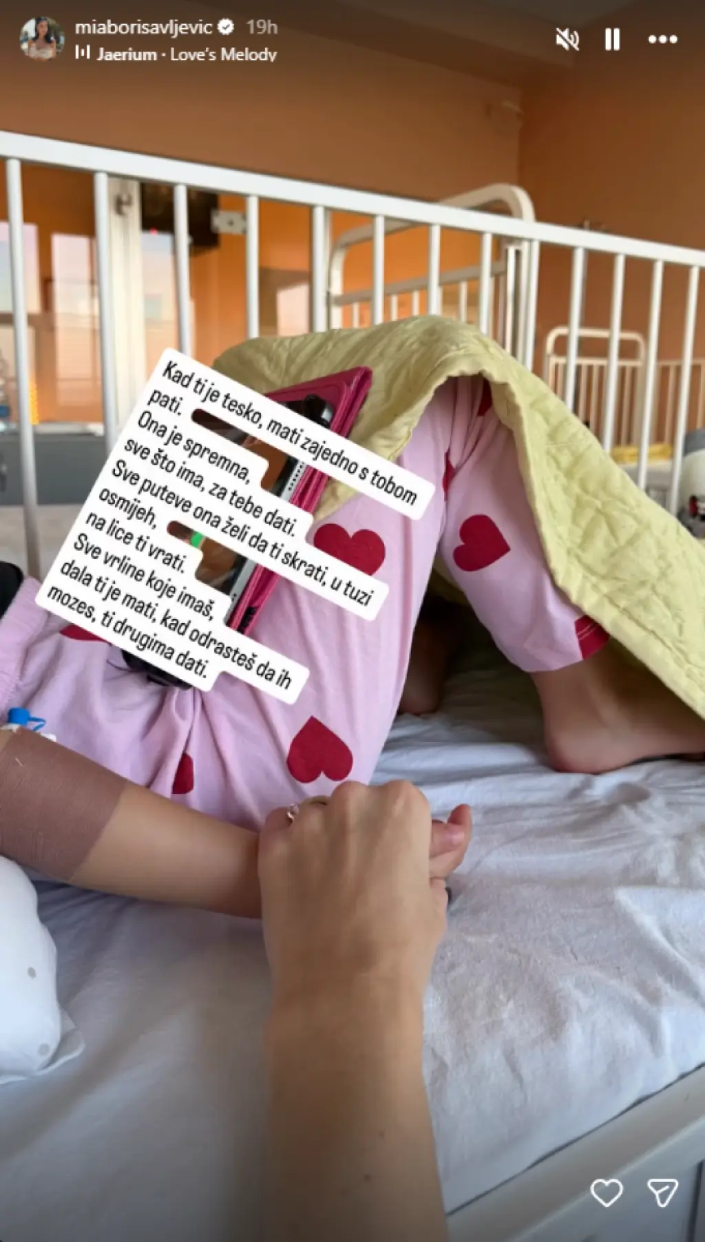 "Hvala svim doktorima i sestrama na Institutu za majku i dete! Primljene smo u subotu i u najbržem roku, Tei je pružena adekvatna terapija. Zadržane smo tri dana na bolničkom lečenju, Tea je sada potpuno zdrava! Svaka čast našim lekarima. Želim vam svima da budete dobro i da se volite i čuvate", poručila je Mia.