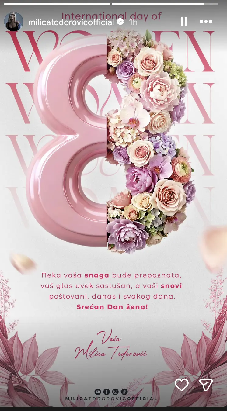 "Neka vaša snaga bude prepoznata, vaš glas uvek saslušan, a vaši snovi poštovani, danas i svakog dana. Srećan Dan žena", napisala je pevačica, potpisavši se sa "Vaša Milica Todorović".