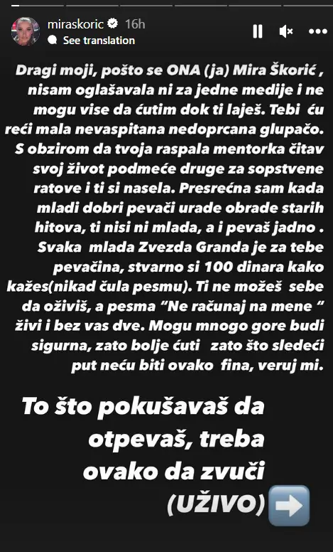 "Dragi moji, pošto se ona (ja) Mira Škorić, nisam oglašavala ni za jedne medije i ne mogu više da ćutim dok ti laješ. Tebi ću reći mala nevaspitana nedo***ana glu*ačo. S obzirom da tvoja raspala mentorka čitav svoj život podmeće druge za sopstvene ratove i ti si nasela", napisala je Mira na svom nalogu na Instagramu, pa dodala: