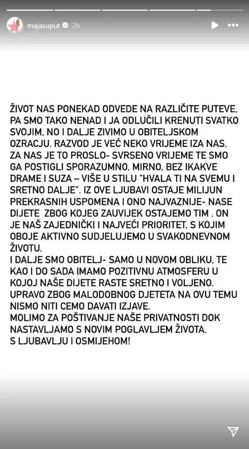 Podsetimo, Maja je u svojoj objavi takođe navela da su se razveli sporazumno i mirno, bez drame i suza, i naglasila da je iz njihove ljubavi ostalo „milion prelepih uspomena, kao i ono najvažnije – njihovo dete, zbog kojeg zauvek ostaju tim.