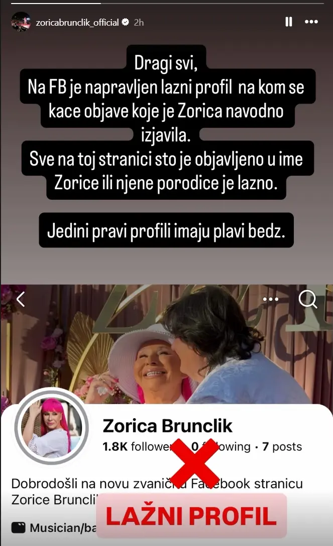"Dragi svi, na Fejsbuku je napravljen lažni profil na kom se kače objave koje je Zorica navodno izjavila. Sve na toj stranici što je objavljeno u ime Zorice ili njene porodice je lažno. Jedini pravi profil imaju plavi bedž", piše na Instagram profilu Zorice Brunclik.