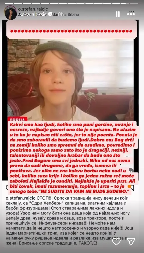 "Stop! Srpska tradicija nisu dečaci koji heklaju, sa 'Odri Hepbern' kapicama, zlatnim kajlama i barbi frizurama! Stop stvaranjima lažnih idola i uzora! Uzor nam mogu biti ona deca koja od najmanjih nogu cepaju drva, čuvaju krave i ovce, voze traktore, poste i pričešćuju se! Influenseri nikada!!! Nemojte nam nametati da je nešto natprosečno i uzorno kada nije! Još jedan marketinški trik, iza kojeg se nešto krije! U najmanju ruku rušenje ideala i razlike iza muškaraca i žena! Brisanje srpske tradicije, takođe", napisao je sveštenik Stefan Rajčić.