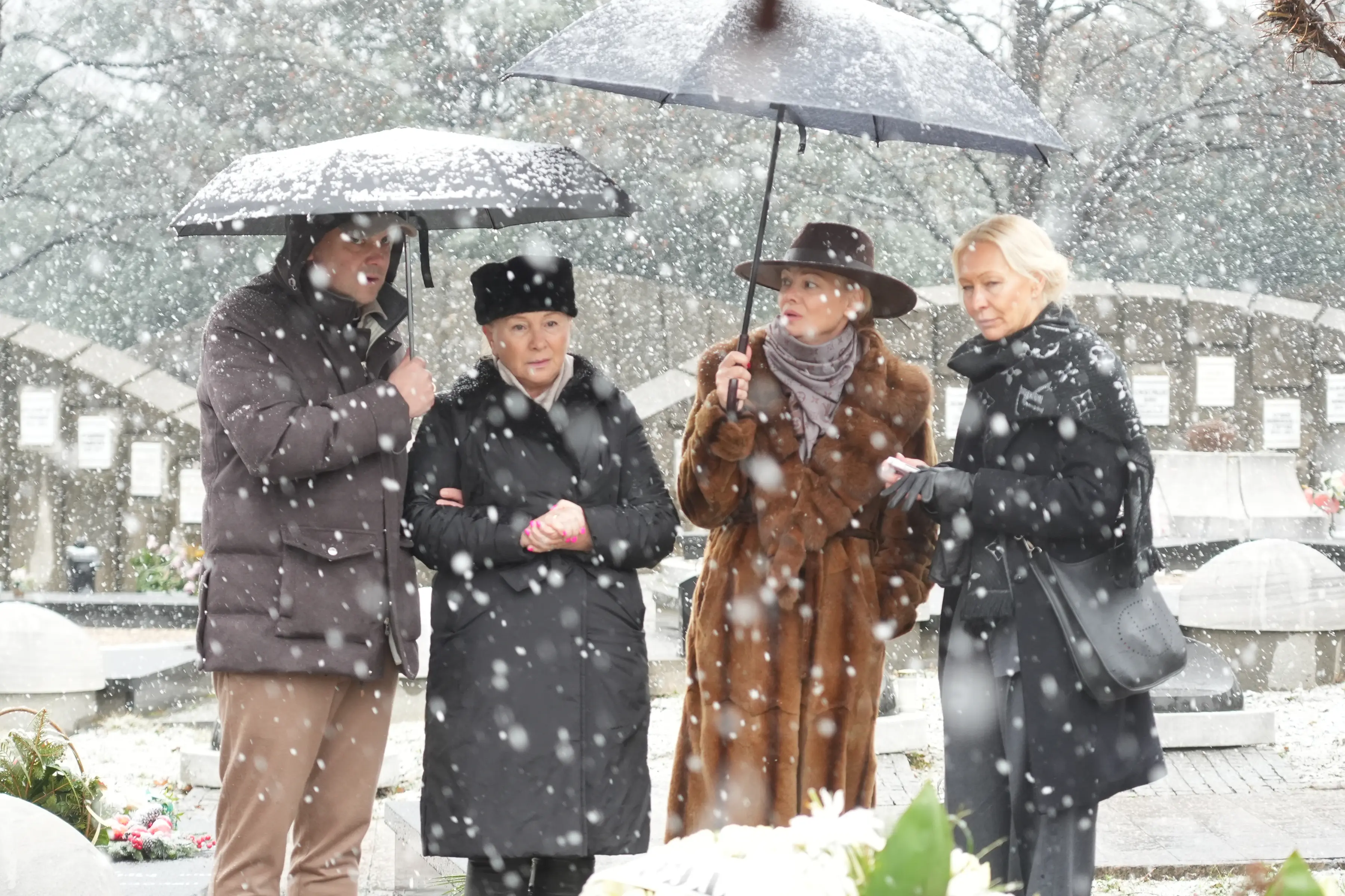 Gocu je s jedne strane pridržavala snajka, a sa druga sin koji je stajao pored groba i sve vreme držao kišobran.