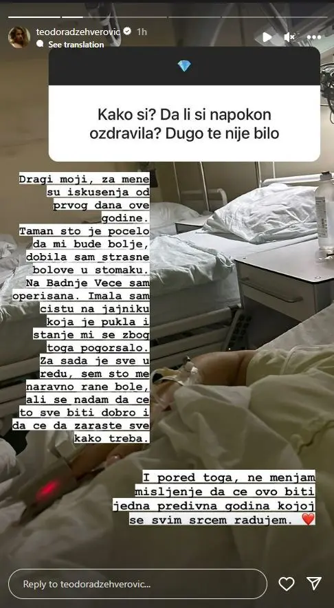 "Dragi moji, za mene su iskušenja od prvog dana ove godine. Taman što je počelo da i bude bolje, dobila sam strašne bolove u stomaku. Na Badnje veče sam operisana. Imala sam cistu na jajniku koja je pukla i stanje mi se zbog toga pogoršalo", započela je Teodora, a onda dodala da se sada oseća bolje: