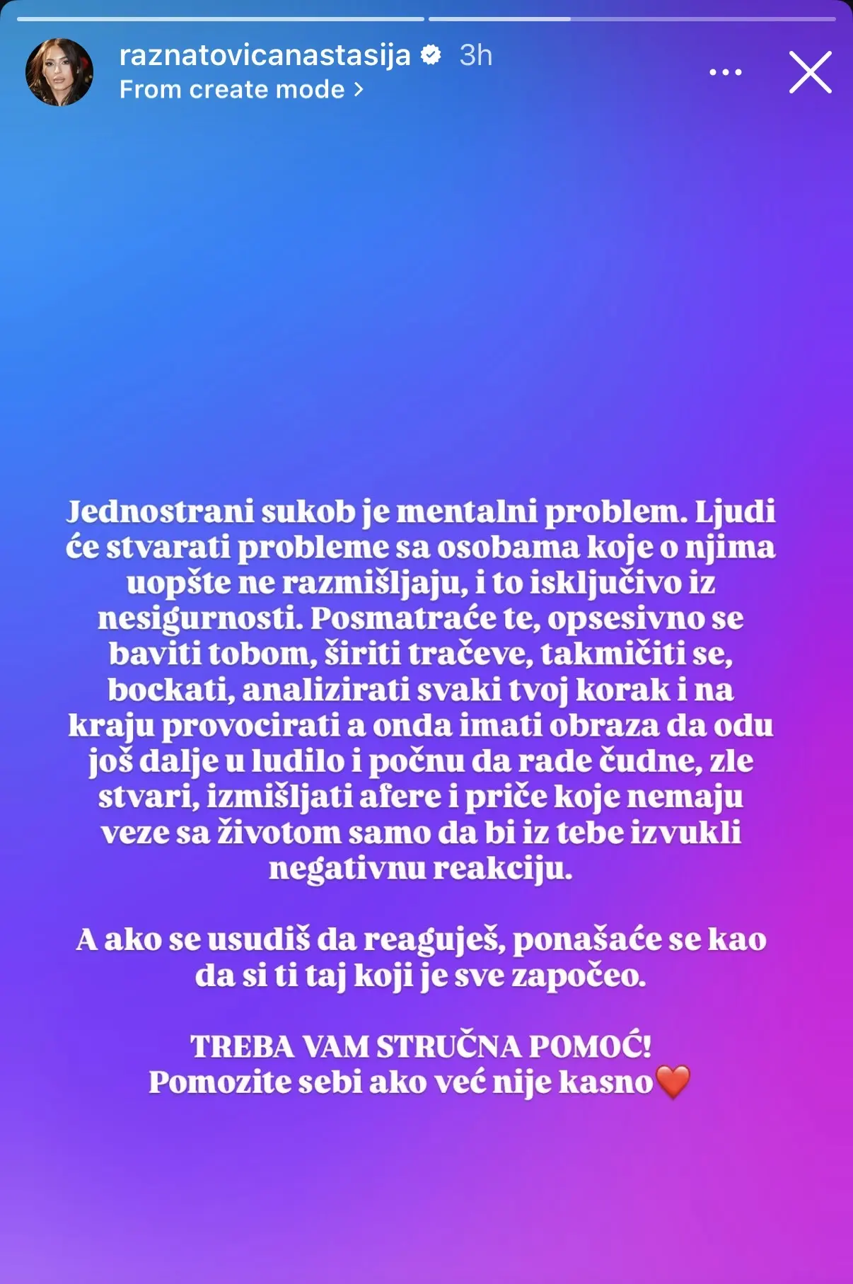 Njenu poruku podelila je i njena majka, Ceca Ražnatović, uz jasno odobravanje i slaganje sa svime što je Anastasija navela.