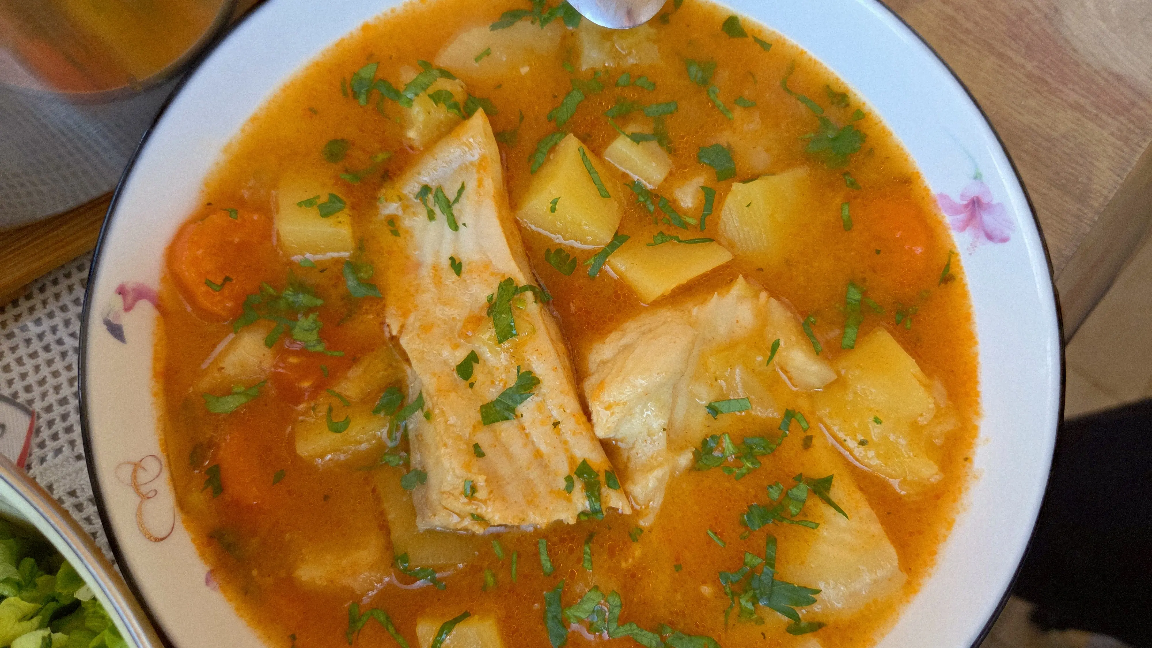 Tek tada dodati biber, kurkumu i lovorov list, pa ubaciti 4 veća parčeta rebara svežeg šarana ili bilo koje ribe koju volite. Kuvati tačno deset minuta da riba ostane cela. Na samom kraju posuti sa puno svežeg persuna i ugasiti vatru.