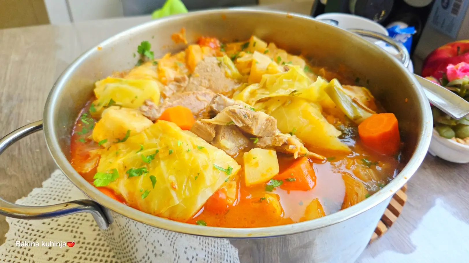 Kuvati sve zajedno još oko 30 minuta jer mladom kupusu ne treba mnogo vremena, a pred kraj dodati kuvani paradajz i suvi začin.