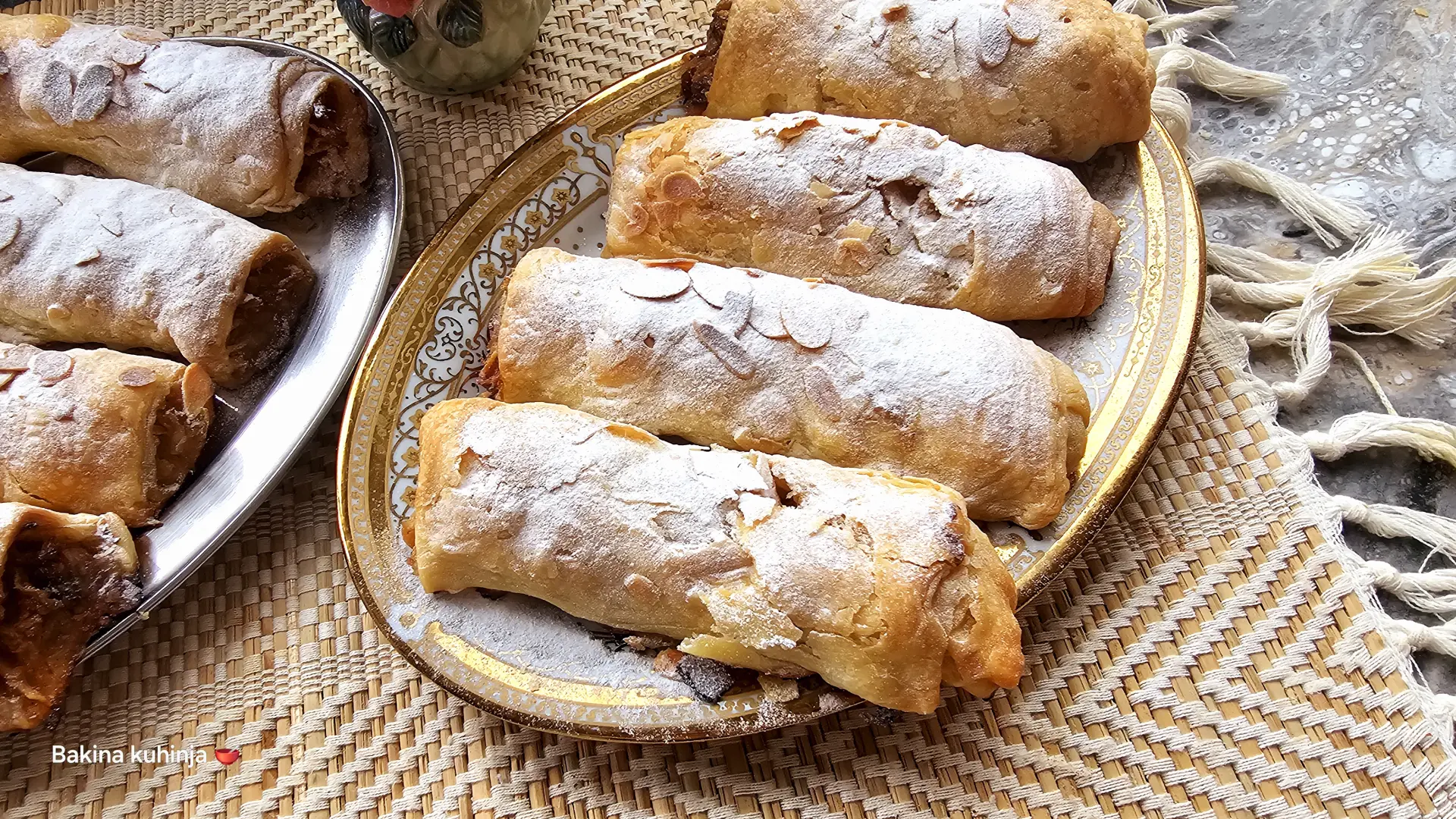 Preklopiti sa 4 strane i i ostaviti sa strane. Svaku preklopljenu koru rukama razvući u pravougaonik i staviti rendane jabuke, cimet, suvo grožđe i banane na nju. Uviti i ređati u podmazan pleh.