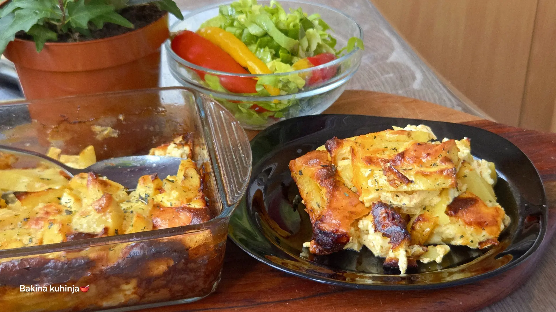 Vatrostalnu posudu podmažite uljem i u nju sipajte pripremljen krompir, a između njega nasumično ubacite štapiće kačkavalja. U posebnoj posudi žicom razbijte jaje, dodajte kiselu pavlaku i mleko, pa to dobro sjedinite i prelijte preko krompira u plehu.