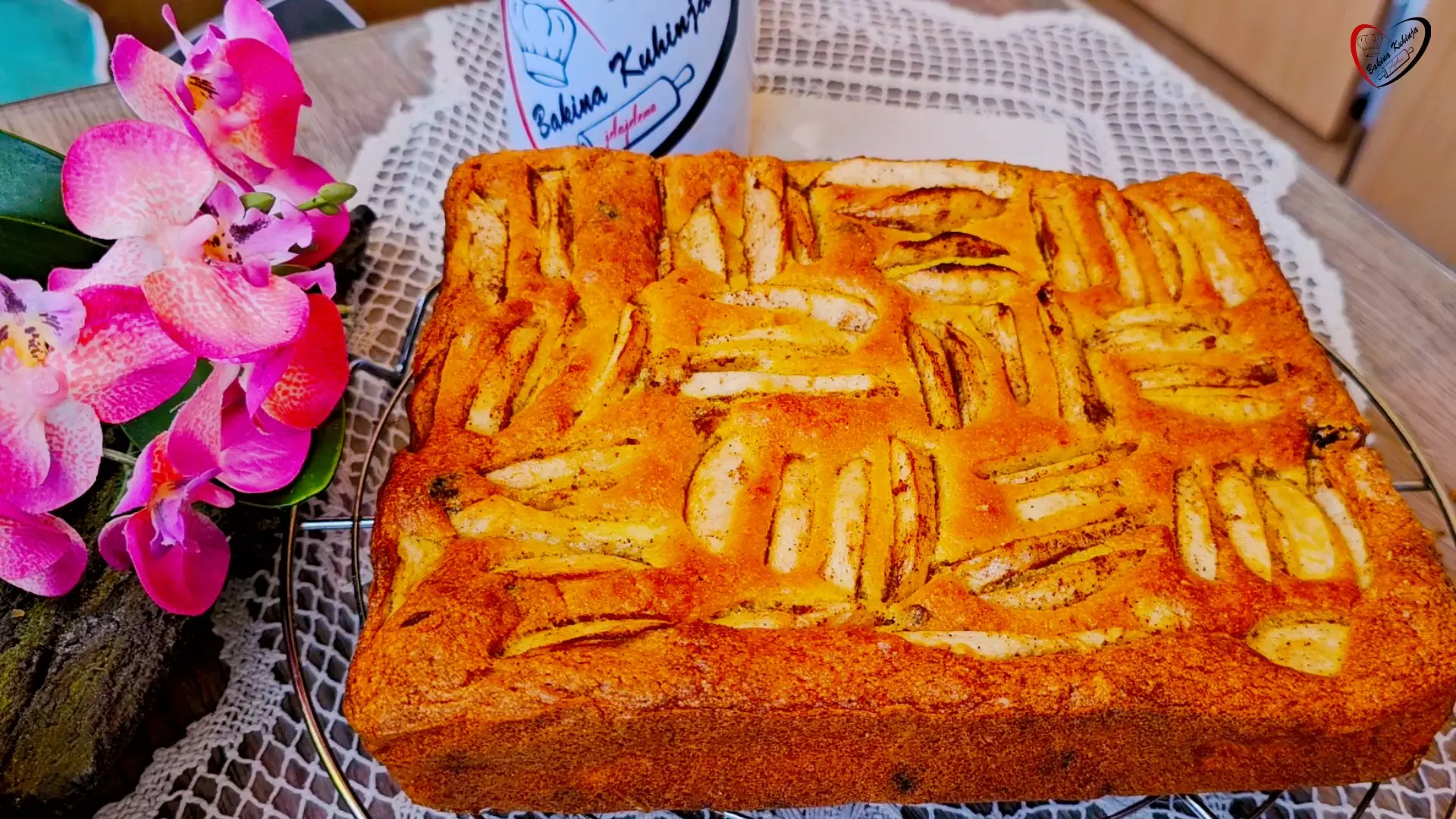 Sve izmešati i sipati u pleh, odozgo poređati kriške jabuka, po četiri kriške uspravno, pa ispod četiri kriške vodoravno i tako do kraja.