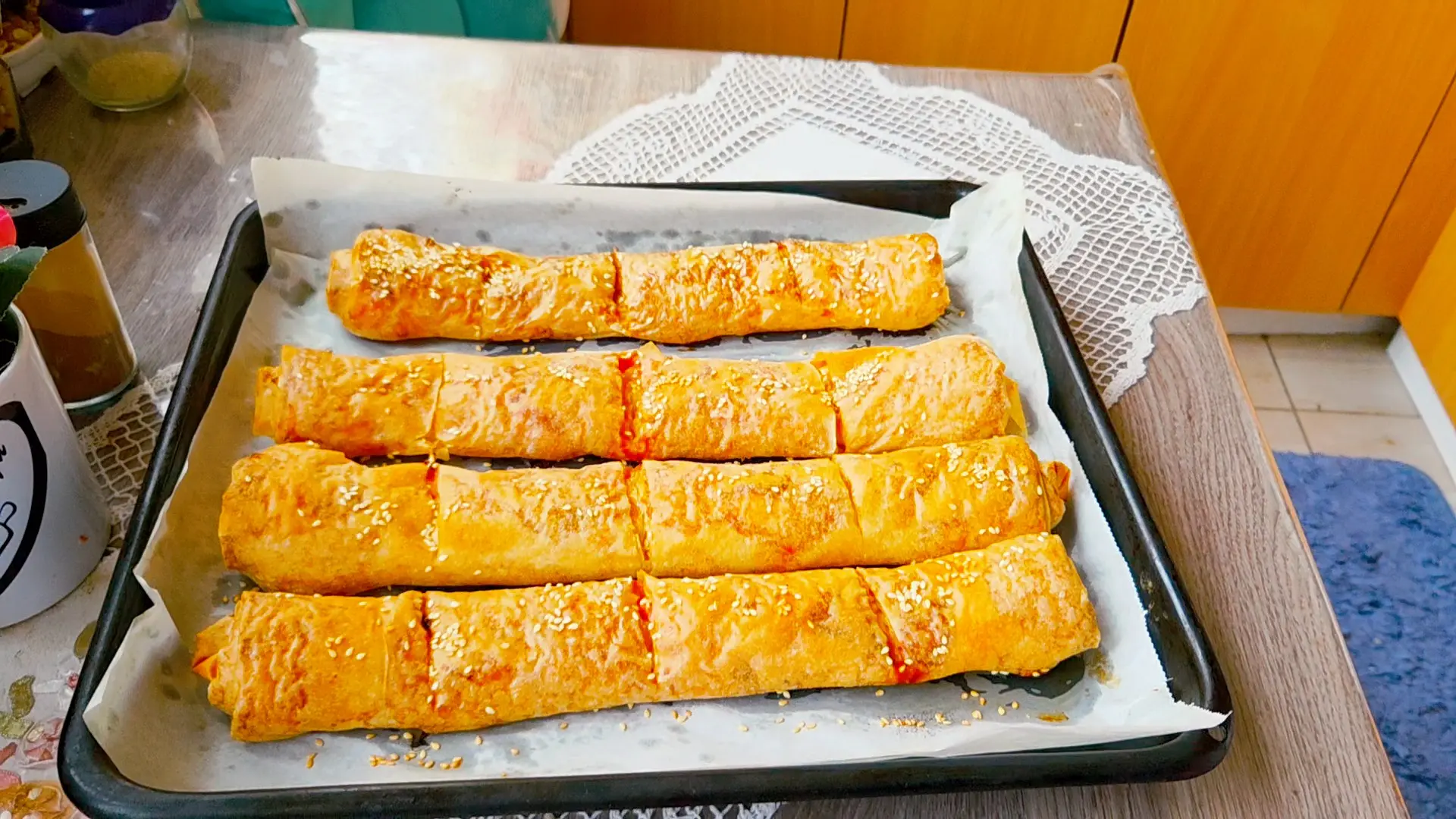Zatim se svaki taj deo opet preseče po sredini, tako da dobijete male rolnice. Premažite ih ostatkom ulja. Zagrejte rernu na 200°C i pecite pitu oko 40 minuta, dok lepo ne porumeni. Kada je pita gotova, izvadite je iz rerne i ostavite je otkrivenu da se ohladi i zadrži svoju hrskavost.