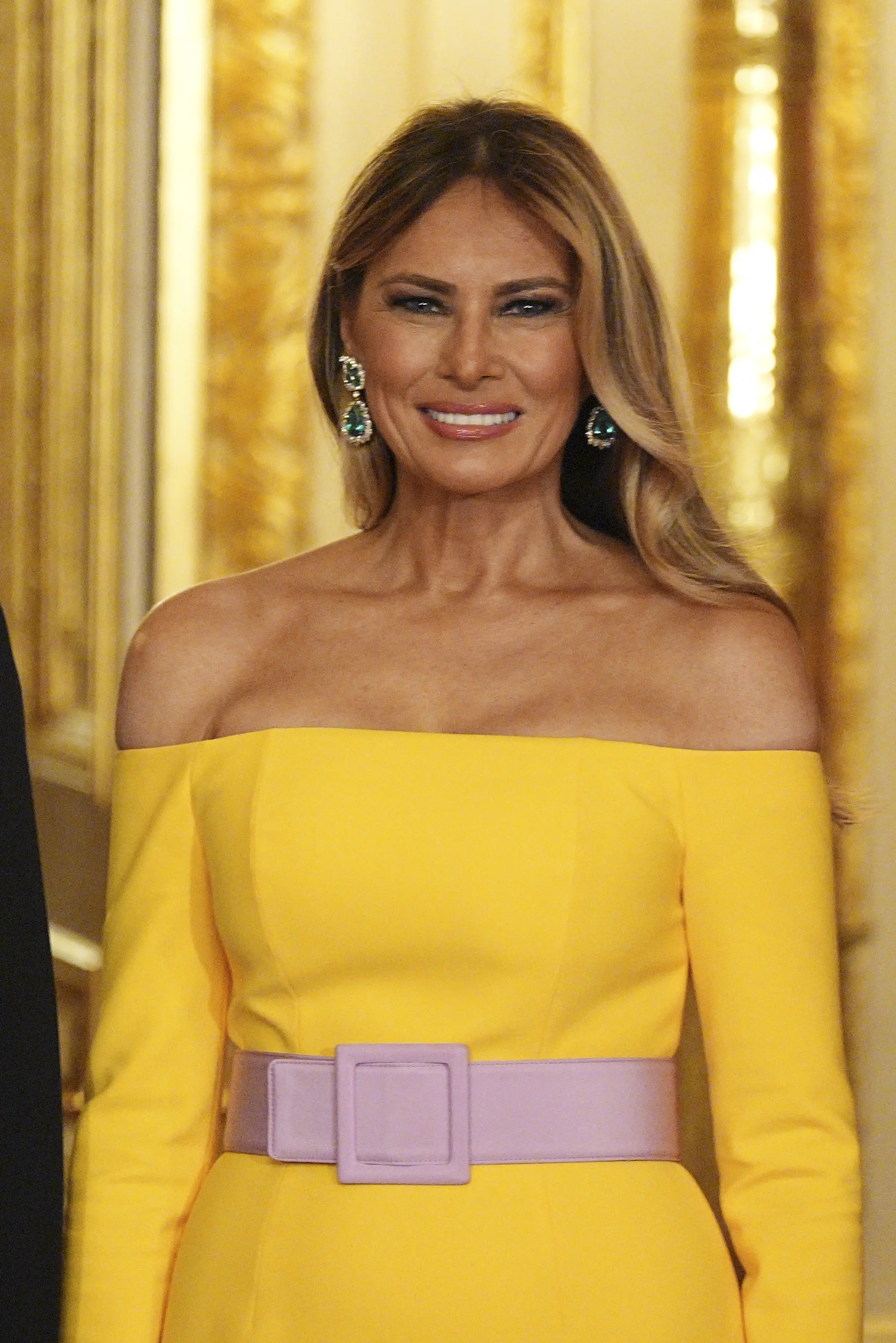 Na gala večeri organizovanoj povodom posete Velikoj Britaniji, Melanija Tramp se pojavila u raskošnoj haljini jarko žute boje, spuštenih ramena, koju je za nju osmislila modna kuća "Karolina Herera".