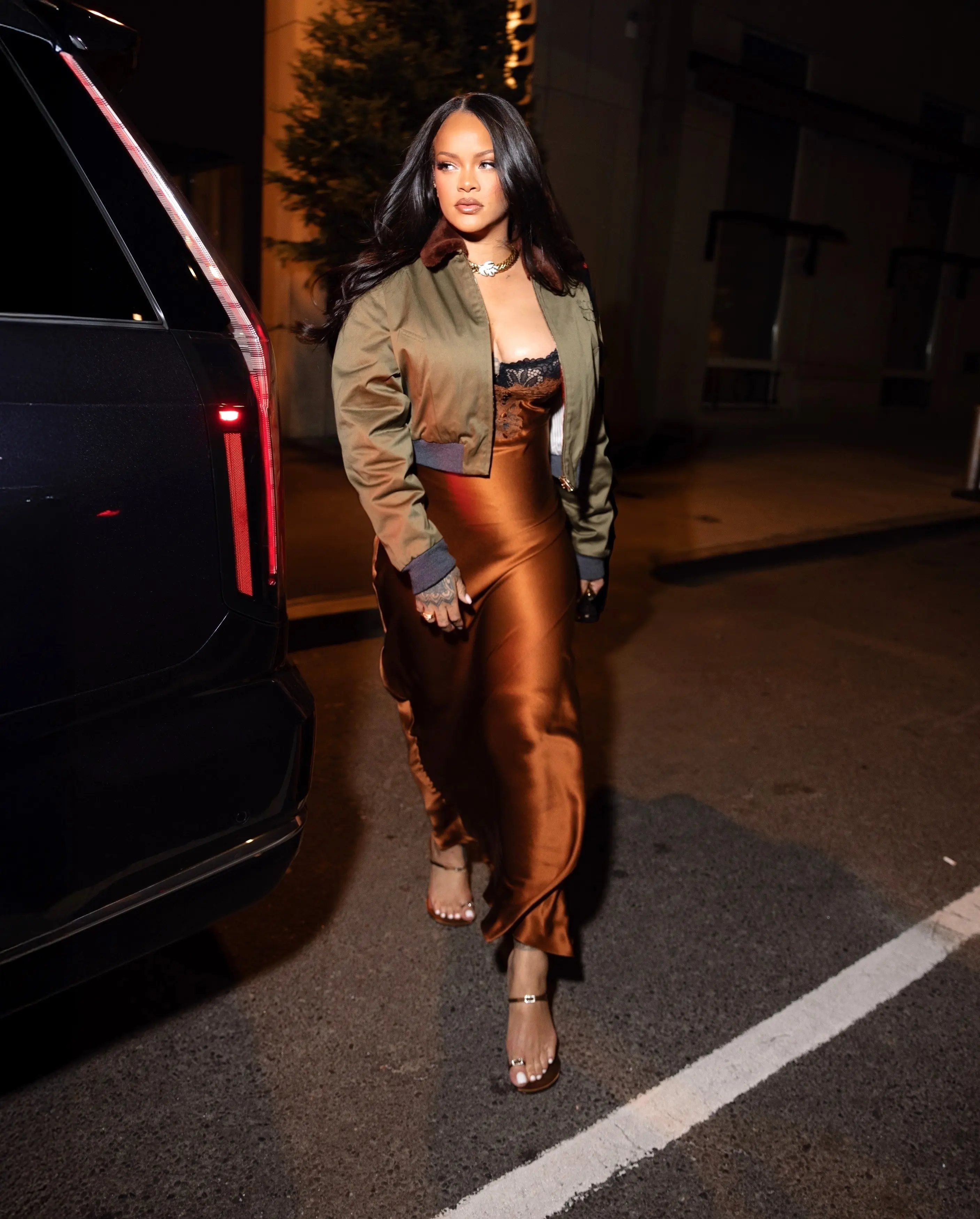 Za ovu priliku odabrala je svilenkastu slip haljinu modne kuće Saint Laurent, dužine do članaka, u prigušenoj narandžastoj nijansi. Ispod haljine diskretno se nazirao crni čipkani grudnjak iz njenog brenda Fenty, što je kombinaciji dalo dozu smelosti.